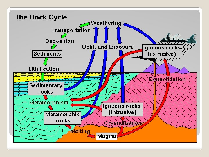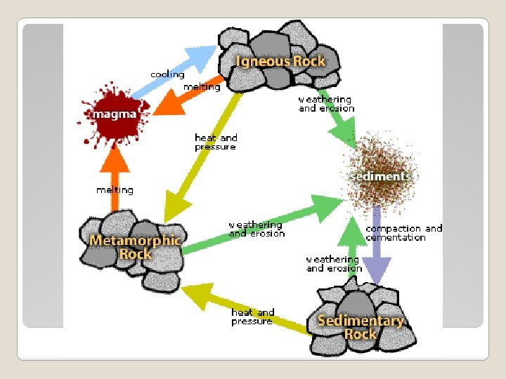 Ø Over time rocks are recycled into other rocks Ø Moving tectonic plates are responsible for destroying and forming many types of rocks Ø Igneous rock can change into sedimentary rock or into metamorphic rock. Ø Sedimentary rock can change into metamorphic rock or into igneous rock. Ø Metamorphic rock can change into igneous or sedimentary rock. The Rock Cycle