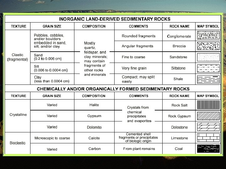 Formation: • Sedimentary rocks form from the COMPACTION & CEMENTATION of rock fragments • Rock fragments are “glued” together by a matrix of calcite, silica, or iron oxide
