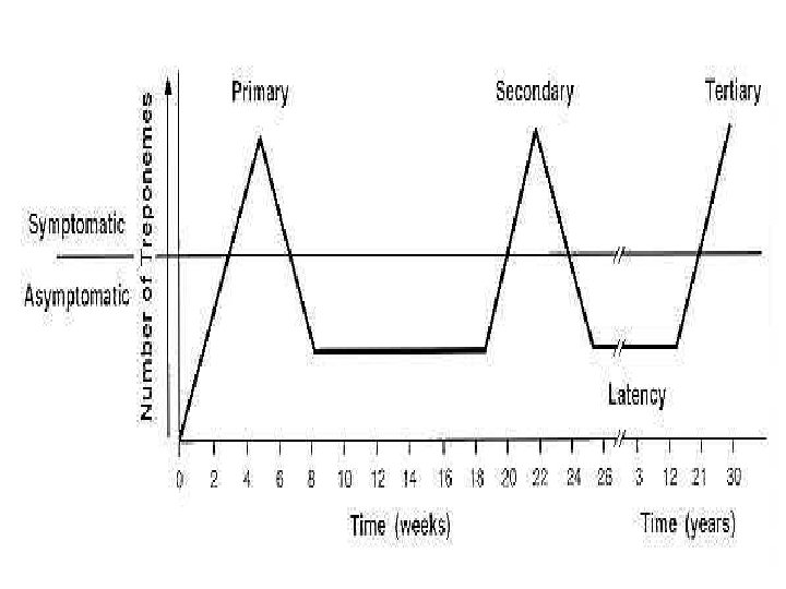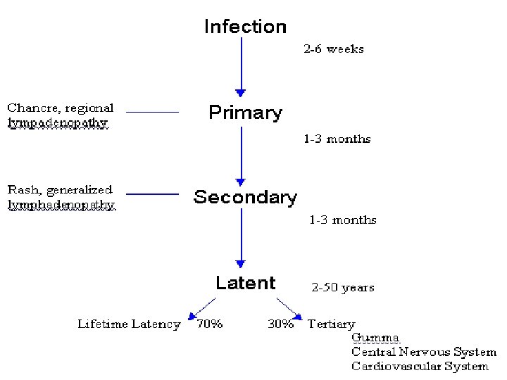 o. Inkubacija iznosi 2 – 10 tjedana o. Primarni stadij – ulcus durum o. Sekundarni stadij – makulopapulozni osip o. Tercijarni stadij – “stadij guma”