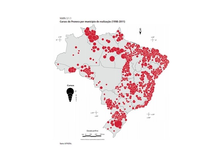 • No período de 1998 a 2010, o PRONERA foi responsável pela escolarização e formação de cerca 400 mil jovens e adultos assentados e/ou acampados da reforma agrária.