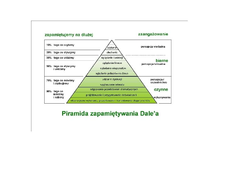 Każdy ma własny styl uczenia i swoje mocne strony. Jesteśmy się w stanie nauczyć: n 10% tego, co czytamy; n 20% tego, słyszymy; n 30% tego, co widzimy; n 50% tego, co widzimy i słyszymy; n 70% tego, co mówimy; n 90% tego, co mówimy, robimy i przeżywamy.