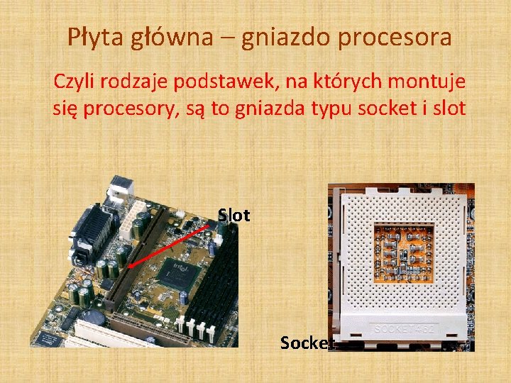 Płyta główna – gniazdo procesora Czyli rodzaje podstawek, na których montuje się procesory, są to gniazda typu socket i slot Socket