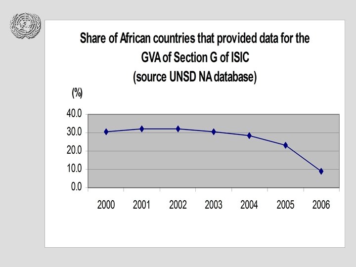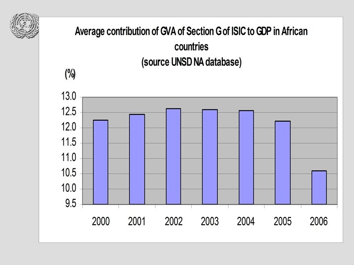 More about distributive trade in Africa Contribution of section G of ISIC to GDP n n n Stable tendency for the last 5 -6 years – 12, 5% on average (without 2006) Highest contribution – Mozambique (23%) Countries above the average – Senegal (17%), Egypt (14%), Zambia (18 -19%) Lowest contribution – Swaziland (5%) The scope of section G in previous versions of ISIC is different from ISIC, Rev. 4 recommended in IRDTS 2008 n n ISIC, Rev. 3. 1 includes repair of personal and household goods ISIC, Rev. 2 includes hotels and restaurants