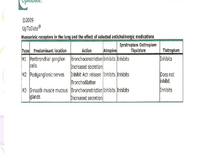 • The activation of M 1 and M 3 receptors by ACh and its analogs stimulates secretion by tracheobronchial glands and causes bronchoconstriction. • On the other hand, activation of M 2 receptors limits further production of ACh and protects against parasympathetic-mediated bronchoconstriction. • Based upon this information, an ideal anticholinergic agent would inhibit only the M 1 and M 3 receptors and spare the M 2 receptors.