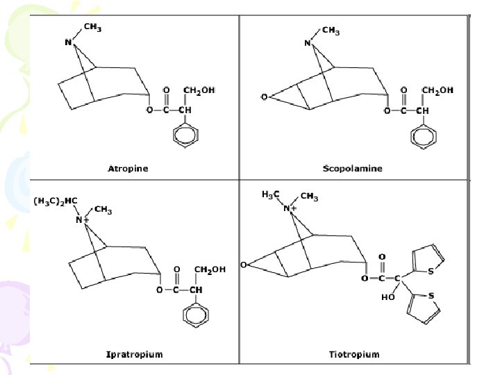 TERTIARY VERSUS QUATERNARY AGENTS • Quaternary ammonium drugs (such as ipratropium) are synthetic derivatives of the naturally occurring tertiary ammonium compounds (such as atropine). • Ipratropium bromide is derived by the introduction of an isopropyl group to the N atom of atropine.