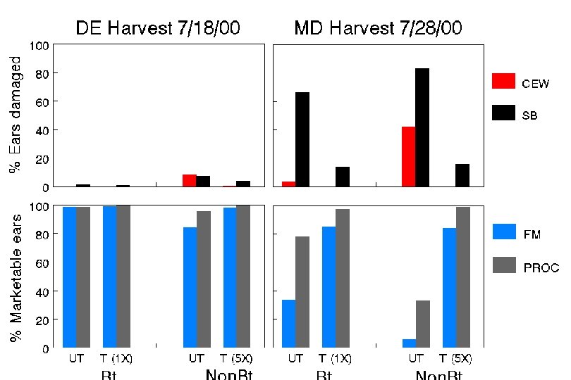 Sap Beetle Timing Experiments on Bt Sweet Corn # Insecticide initiated at 50% fresh silk provides the best control of SB. # Two applications spaced 4 days apart is more effective than a single application. # Schedules greater than 2 treatments do not consistently result in increased control efficacy.