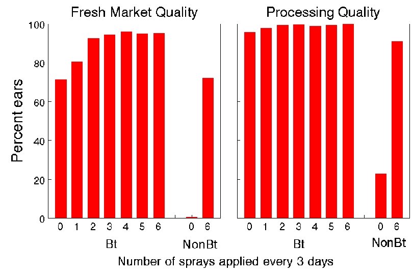 • Fresh market outlets demand high ear quality - >98% clean ears. • Processing standards allow more insect damage - >90% clean ears if kernel injury is confined on the ear tip. • Requires heavy use of insecticides • Most treatments on fresh market corn are applied by ground. • Insecticides used on processing corn are applied by air. • Time-consuming and requires considerable management and logistical coordination.
