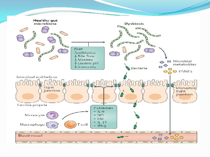 Gut microbiota and NAFLD: �Gut microbiota is defined as the microorganisms harboured by each person and is characterized by a high number of genes collectively called the microbiome, which is not equally distributed along the intestine, since the number of species increases from the esophagus to the rectum. �Normal human gut is colonized by a large number of microorganisms, at least 100 trillion, which contribute to various functions such as digestion, vitamin synthesis and resistance to colonization of the intestine by pathogens. �Qualitative and quantitative modification of gut microbiota called dysbiosis, which can be considered a predisposing factor for the development and progression of several chronic diseases related to metabolic alterations including NAFLD.