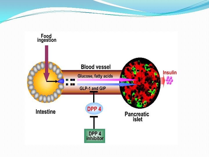 Gut hormones and the liver: �Gut hormones (Incretins) are hormones released from the gut directly into the bloodstream in response to ingestion of food, they modulate the insulin secretory response where incretins account for at least 50% of the total insulin secreted. �The two best studied incretins are glucose-dependent insulinotropic peptide (GIP) and glucagon-like peptide-1 (GLP-1), both incretins are rapidly deactivated by an enzyme called dipeptidyl peptidase 4 (DPP 4).