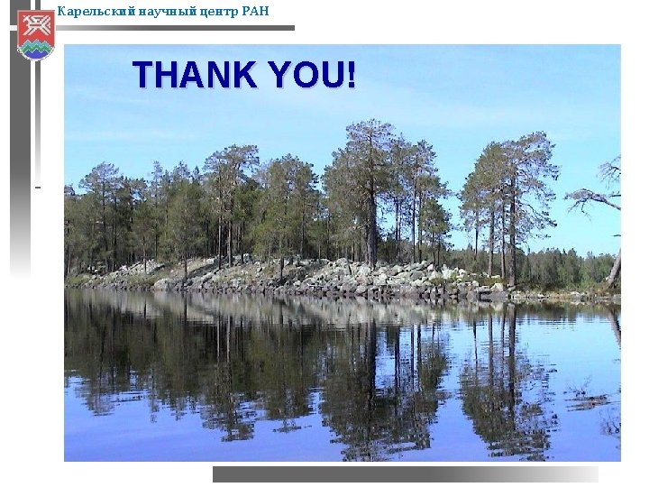 Карельский научный центр РАН ACADEMIC SCIENCE IN KARELIA Karelian Research Centre is one three regional research centres of the Russian Academy of Sciences in Northwest Russia The Centre comprises 7 institutes: of Biology; Northern Water Problems; Geology; Forest Research; Applied Mathematical Research; Economic Studies; Language, Literature and History Kar. RC of RAS employs 767, including 382 research staff, among which 3 are RAS Corresponding Fellows, 72 have post-doctoral, and 220 – doctoral degrees Over 300 basic and applied research projects are implemented annually, including integrated multidisciplinary studies Many researchers from Kar. RC take part in the preparation of strategic development plans and programmes for the region