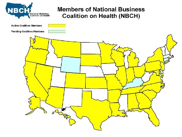 National Business Coalition on Health (NBCH) o Membership of 60 business and health coalitions n o National network of thousands of employers and 25 million employees and their dependents Mission: Health and health care reform, through value based purchasing, community by community