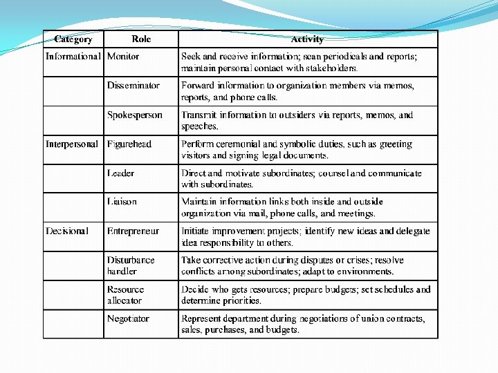 Roles of Manager The manager’s roles are divided into three categories: �Interpersonal Roles �Informational Roles �Decisional Roles