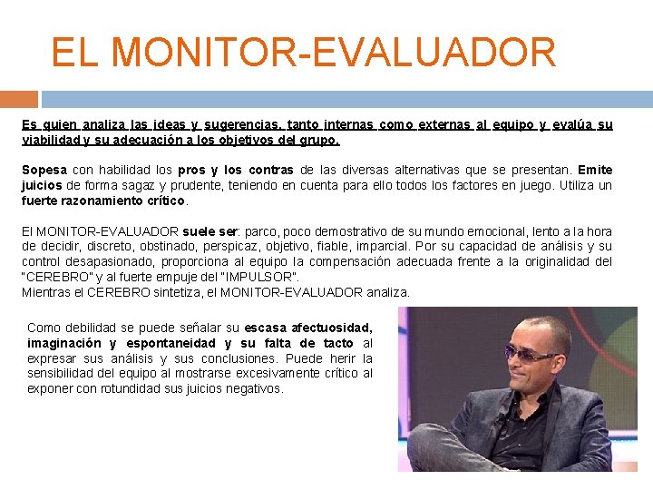 EL MONITOR-EVALUADOR Es quien analiza las ideas y sugerencias, tanto internas como externas al equipo y evalúa su viabilidad y su adecuación a los objetivos del grupo. Sopesa con habilidad los pros y los contras de las diversas alternativas que se presentan. Emite juicios de forma sagaz y prudente, teniendo en cuenta para ello todos los factores en juego. Utiliza un fuerte razonamiento crítico. El MONITOR-EVALUADOR suele ser: parco, poco demostrativo de su mundo emocional, lento a la hora de decidir, discreto, obstinado, perspicaz, objetivo, fiable, imparcial. Por su capacidad de análisis y su control desapasionado, proporciona al equipo la compensación adecuada frente a la originalidad del “CEREBRO” y al fuerte empuje del “IMPULSOR”. Mientras el CEREBRO sintetiza, el MONITOR-EVALUADOR analiza. Como debilidad se puede señalar su escasa afectuosidad, imaginación y espontaneidad y su falta de tacto al expresar sus análisis y sus conclusiones. Puede herir la sensibilidad del equipo al mostrarse excesivamente crítico al exponer con rotundidad sus juicios negativos.