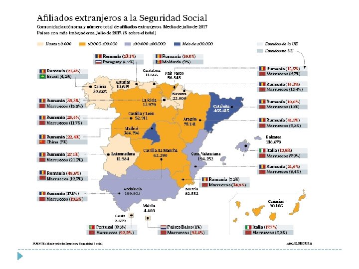 V. Arii de destinație � distribuția geografică a imigranților români concentrare în Madrid și pe litoralul mediteraneean � în interiorul țării: Zaragoza, Toledo � Cf. Padrón municipal, cifras de población: � � 865, 707 rumanos en España, distribución por provincias