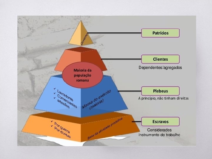 Sociedade Romana Patrícios Plebeus ▧ Grandes e médios ▧ proprietários de terras; ▧ Topo da pirâmide social; Povos vencidos em guerra ou estrangeiros; ▧ Excluídos da política; ▧ Detinham o poder político; ▧ Clientes ▧ Ex-escravos ou filhos deles; ▧ Livres; ▧ Dependiam dos Patrícios que lhes davam terras em troca de proteção e serviços; Escravos ▧ Pouco numerosos nesse período; ▧ Escravidão por dívidas; Trabalho no campo e artesanato;