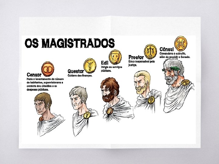 Cônsules Magistrados Censores ▧ Eram dois; ▧ ▧ Presidiam o Senado e a Assembleia; Contagem e Classificação da População segundo a renda. ▧ Lista de Senadores ▧ Propunham Leis; ▧ Mandatos de um ano; ▧ Eleitos pela Assembleia Centurial. Edis ▧ Policiamento, abastecimento, limpeza e vigilância da cidade. ▧ Manutenção dos Costumes e organização de festas cívicas e religiosas; Pretores ▧ Responsáveis pelo Judiciário. Questores ▧ ▧ Responsáveis pelo Tesouro Público; Arrecadação de Impostos;