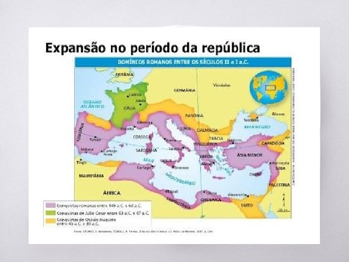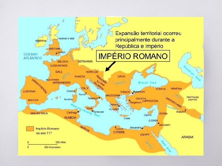 Expansão Territorial ▧ Núcleo inicial de Roma: uma cidade- Estado; ▧ Expansão: busca de recursos para a sobrevivência; ▧ Primeira Conquista: Península Itálica Século V e II a. C. ; Expansão Potência Econômica e Militar; Ampliou Fronteiras; Inimigos escravizados; Conquistou terras férteis; Encontrou Metais preciosos; Crescimento Comercial;