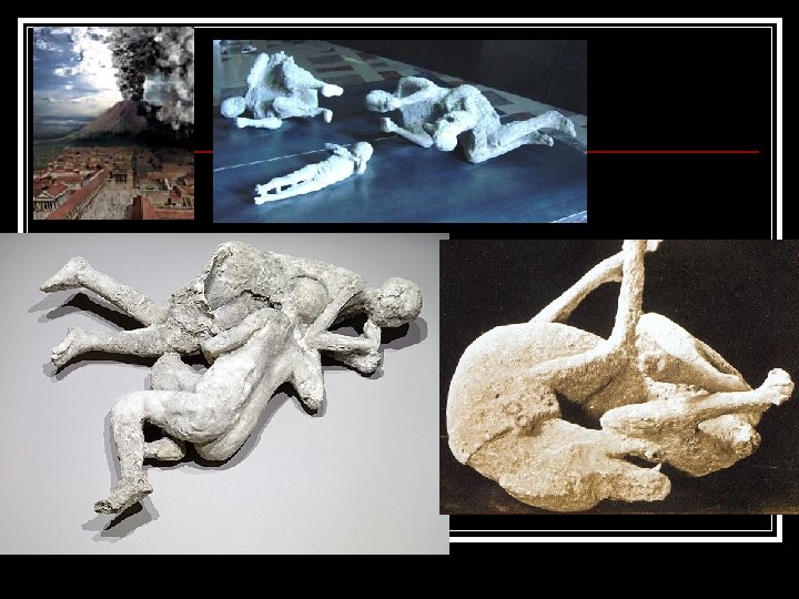 Pompeii The cities of Pompeii and Herculaneum were buried by the horrendous eruption of Mount Vesuvius in 79 CE n Many paintings and art were destroyed n Many sculptures of bronze, stone, and marble as well as buildings were eventually recovered n Body cast have been made of victims buried in the volcanic ash. n