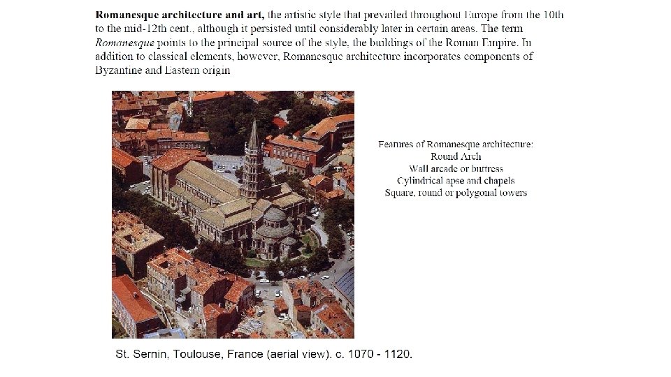 Romanesque Art • Years: 1100 -1150 CE • Region: Western Roman Empire • Style: Fused Roman, Byzantine, German styles • Books: Illuminated manuscripts were lavish and popular • Architecture: Semicircle arches in windows, doors to create space in churches; sculptures of Christian history on church pillars, doors, etc. • Paintings: Murals