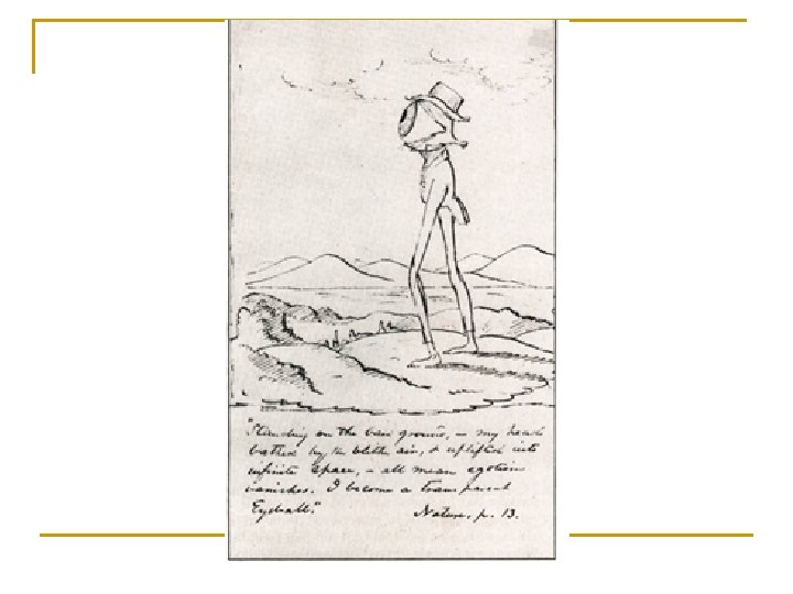 American Romantics: Emerson, Thoreau, Whitman n More direct connection with Nature: q q q n Emerson: “transparent eyeball”; “Nature is the incarnation of thought” Thoreau: “Am I not partly leaves and vegetable mould myself? ” Whitman: “My tongue, every atom of my blood, form’d from this soil, this air” Identification without personification