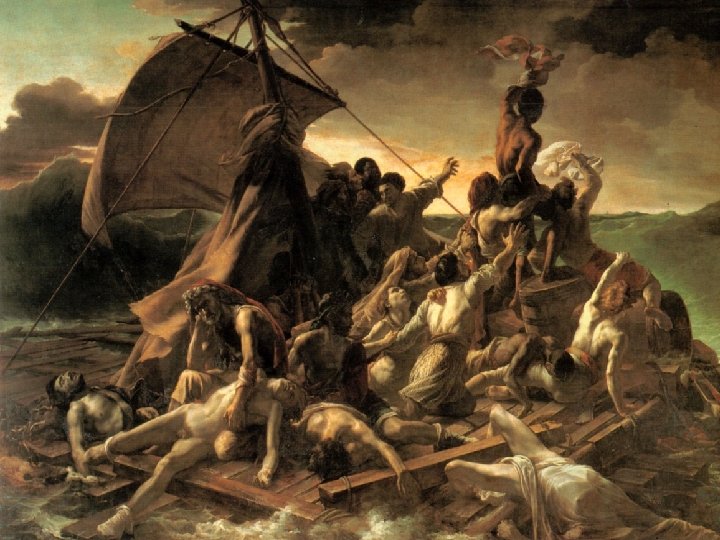 Il quadro di Géricault, ”La zattera della Medusa”, prende spunto da un fatto di cronaca successo nel 1816: l’affondamento della nave francese Medusa. Gli occupanti della nave si rifugiarono su una zattera che rimase abbandonata alle onde del mare per diverse settimane; vissero un’esperienza terribile, che condusse alla morte gran parte di loro. Solo una quindicina di uomini furono tratti in salvo. È l’opera più famosa di Géricault. Periodo storico in cui è nata questa tela: La Francia era appena uscita dalla Rivoluzione Francese e poi l’impero napoleonico. La zattera della Medusa divenne la metafore di un naufragio che vedeva coinvolta tutta la nazione francese. Questo quadro, dà l’immagine psicologica della Francia dopo che la Rivoluzione si è conclusa con il fallimento dell’impero. Il quadro di Géricault, usa un episodio di cronaca per esprimere la vita umana in bilico tra speranza e disperazione. Utilizza il classico sviluppo piramidale(due piramidi). La prima, parte dall’uomo in basso a sinistra ed ha il vertice nell’uomo che, di spalle, sta agitando un panno. È la direzione umana che va dalla disperazione, di quelli che sono morti, alla speranza, di chi ha ancora la forza per sperare di essere visto da qualcuno che vada a salvarli. La seconda piramide parte dalle onde del mare fino all’albero che sorregge la vela. Queste due piramidi opposte danno un tratto drammatico alla scena.