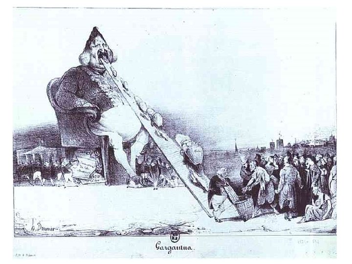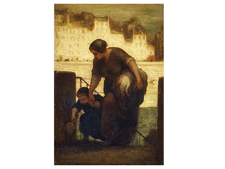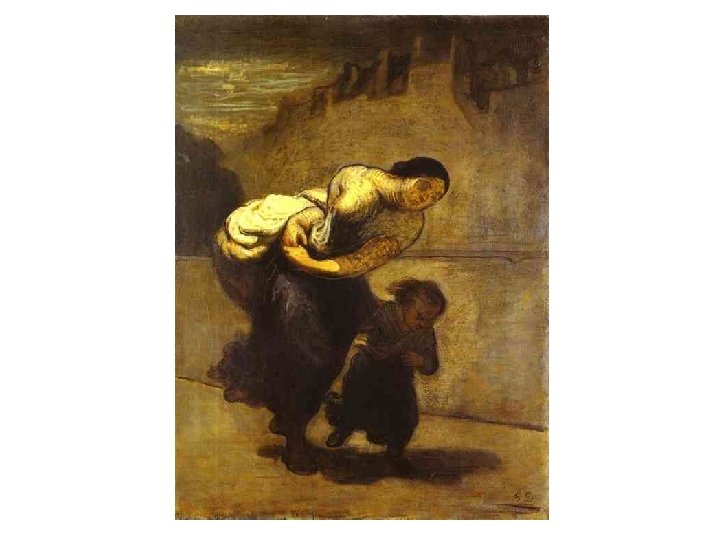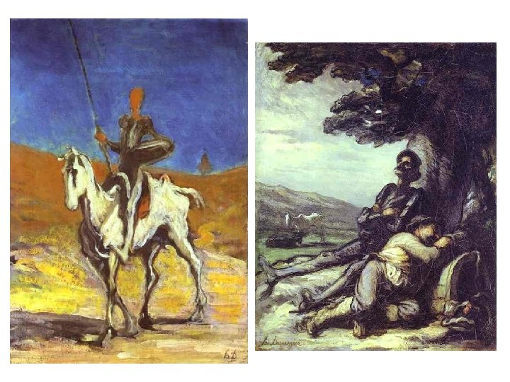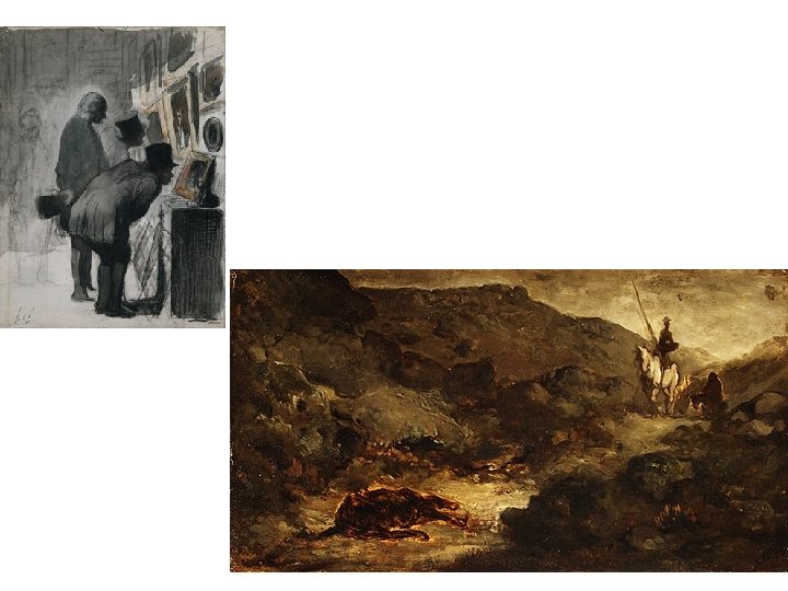 Honoré Daumier ( 1808 -1879) • ještě spjat s romantismem • odpor ke klasicismu ale zálibu v Rubensovi • 1828 začal litografovat a kreslit politické karikatury v republikánském duchu • spolupráce s časopisem La Caricature, později Charivari (kde bylo terčem jeho výsměchu francouzské měšťáctví) • 1848 účast v soutěži na alegorické znázornění republiky; vyvrcholení jeho realistického stylu • další náměty děl hojně voli z literatury (La Fontaine, Moliére, Cervantes); divadlo, soudní prostředí, každodenní život prostých lidí