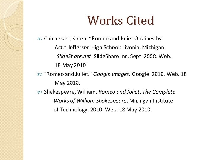 Works Cited Chichester, Karen. “Romeo and Juliet Outlines by Act. ” Jefferson High School: Livonia, Michigan. Slide. Share. net. Slide. Share Inc. Sept. 2008. Web. 18 May 2010. “Romeo and Juliet. ” Google Images. Google. 2010. Web. 18 May 2010. Shakespeare, William. Romeo and Juliet. The Complete Works of William Shakespeare. Michigan Institute of Technology. 2010. Web. 18 May 2010.