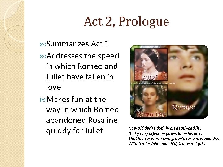 Act 2, Prologue Summarizes Act 1 Addresses the speed in which Romeo and Juliet have fallen in love Makes fun at the way in which Romeo abandoned Rosaline quickly for Juliet Now old desire doth in his death-bed lie, And young affection gapes to be his heir; That fair for which love groan'd for and would die, With tender Juliet match'd, is now not fair.