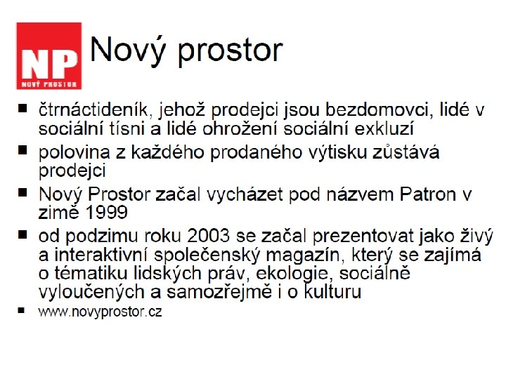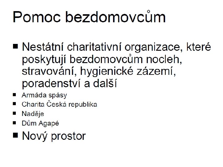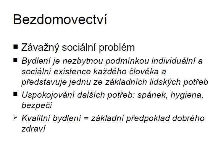 Charakteristika bezdomovců • Osoby bez možnosti trvalého bydlení a trvalého zázemí = osoby bez přístřeší • Formy bezdomovectví: – Zjevní (osoby, které žijí mimo standardní hranice sociálních norem a návyků) – ulice, nádraží, MHD, park, veřejné noclehárny – Skrytí (velmi obtížná evidence) – budovy určené k demolici, vraky aut, les, kanály, kontejnery – Potenciální (lidé, kterým bezdomovectví hrozí) – nejisté bydlení - podnájem, opouštějící ústavní výchovu, vězení, psychiatrické léčebny