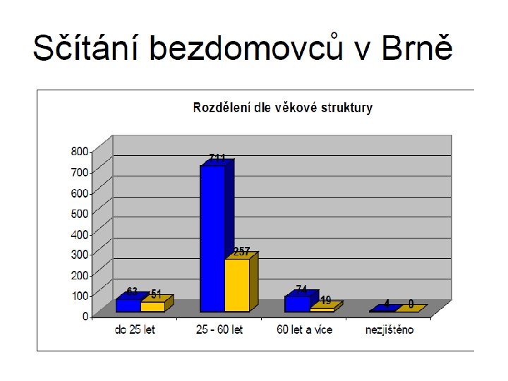 Počet bezdomovců v ČR • žádné přesné statistiky počtu bezdomovců v ČR nejsou vedeny, odhady poskytované různými institucemi se poměrně silně různí, rozmezí 35 000 až 75 000 lidí bez trvalého obydlí (vychází z odhadů organizace Naděje) • nárůst o 10 % ročně • Sčítání Brno, 2006 o celkem 1 179 osob, o 852 mužů (72, 5 %) o 327 žen (27, 5 %)