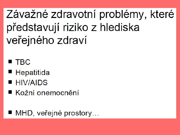 Výživa • Výživa nedostatečná kvantitativně i kvalitativně • Abusus alkoholu, kouření, jiné návykové látky • Strava nedostatečná, nepravidelná, nedostatek ovoce, zeleniny, mléčných výrobků • Nedostatečný příjem vitaminů, minerálních látek, antioxidantů, vlákniny • Nízká nutriční hodnota stravy • Nekvalitní (zkažené) potraviny • Možnost přenosu alimentárních onemocnění