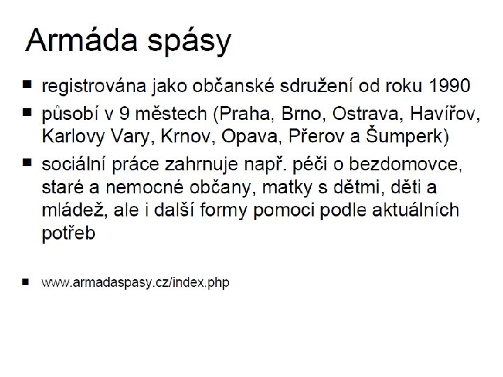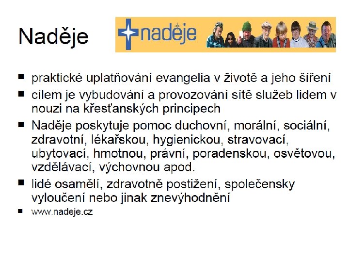 Potravinové banky • Česká Federace potravinových bank je spolek s humanitárním zaměřením. • Je nevládní, apolitická a není vázána na žádné náboženské hnutí. • Shromažďuje zdarma potraviny, skladuje a přiděluje je humanitárním nebo charitativním organizacím, které poskytují potravinovou pomoc potřebným lidem. http: //www. potravinovabanka. cz/