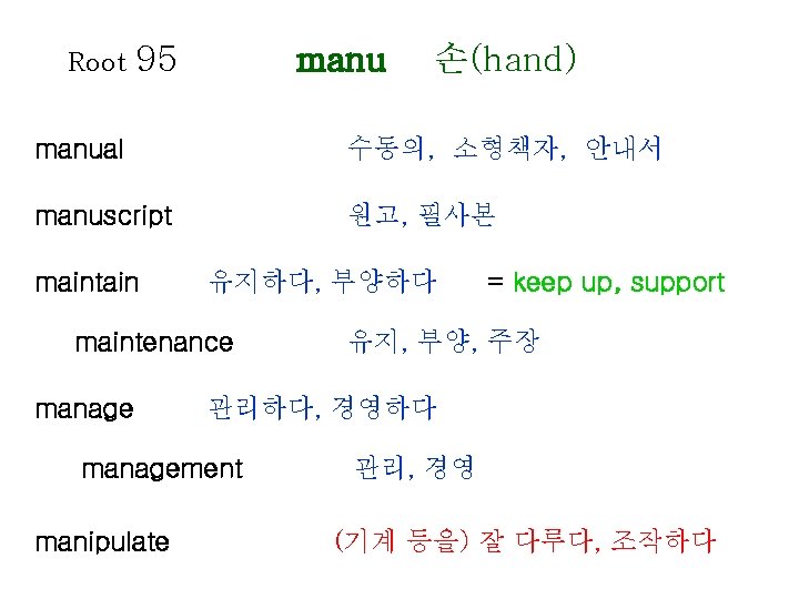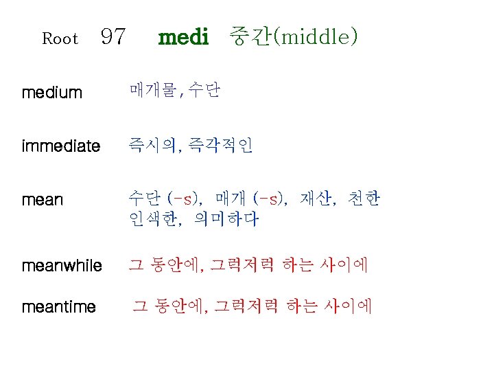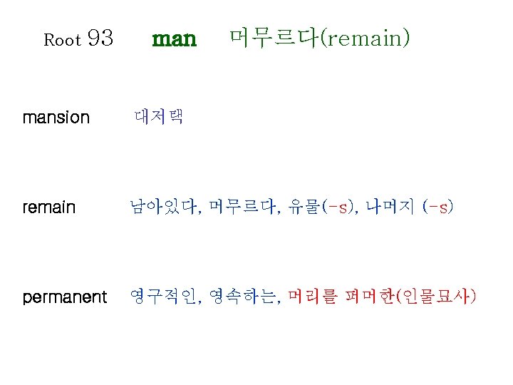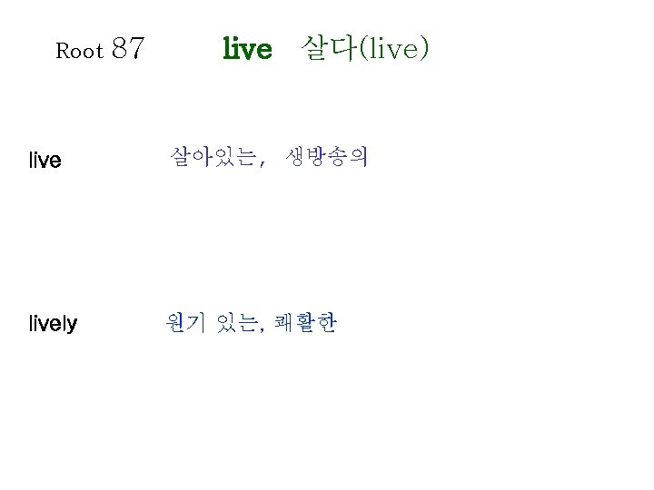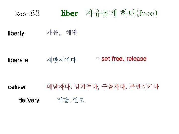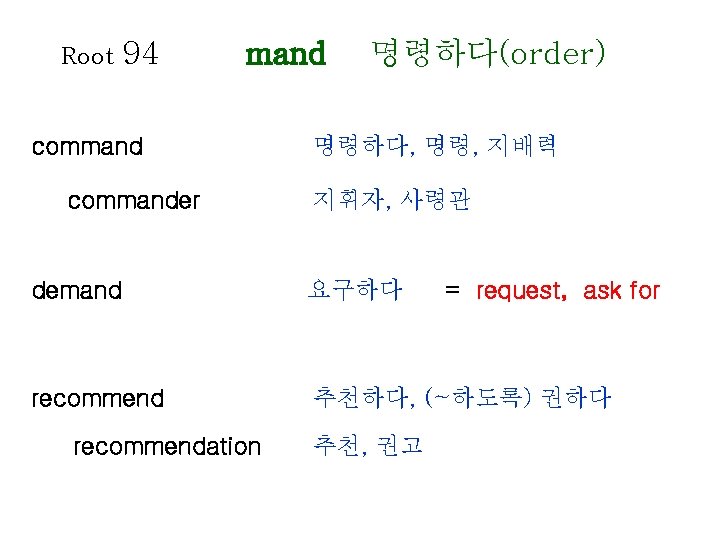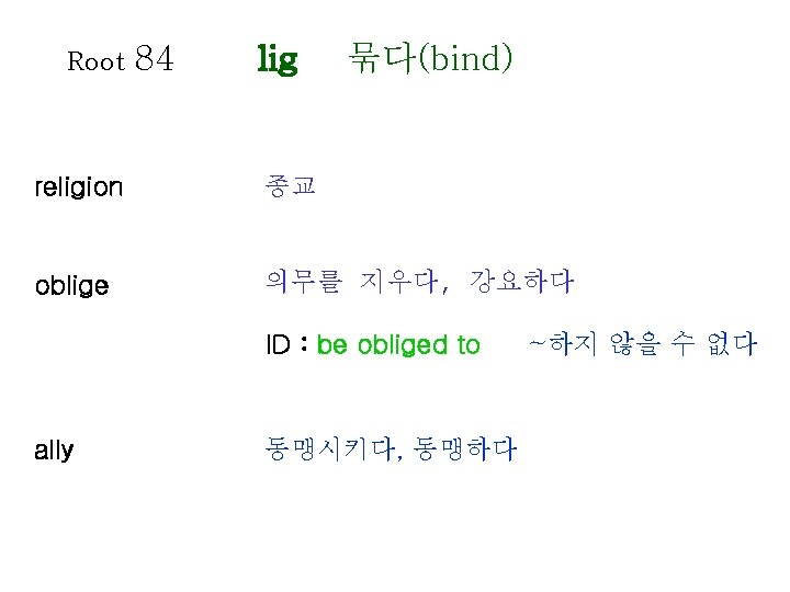 Root 80 1 lect gather collect gather recollect Slides: 20 Download presentation Root 80 -1 lect 모으다(gather) collect 수집하다, 모으다 = gather recollect 회상하다 = recall, remember elect 선출하다, 결정하다 intellect 지성, 감성 intelligent 영리한, 총명한 intelligence 지능, 지성 Root 80 -2 lect 모으다(gather) neglect 무시하다 = overlook, ignore elegant 우아한, 세련된 = graceful, refined lecture 강의, 강연 legend 전설, 구전 diligence 근면, 부지런함 diligent 부지런한 Root 81 leg 법률(law) legal 합법적인 Op : illegal loyal 충성스런 = faithful privilege 특권, 특전 delegate 대표, 대리인 colleague (직장) 동료 Root 82 lev 올리다(raise) relieved 안도하는 relief 안도 lever 지레 elevator 엘리베이터 relevant 적절한, 관계가 있는 Root 85 limin 경계(border) eliminate 제거하다, 없애다 = do away with, remove limit 제한, 제한하다 = restrict, confine limitation 제한, 한계 Root 86 liter 글자(letter) literature 문학 literally 글자 그대로 literary 문학의, 저작의 literate 읽고 쓸 줄 아는 = to the letter Op : illiterate Root 88 locomotive location local loc 장소(place) 기관차 위치하다 위치, 장소 지방의 = obligation Root 89 logical apology apologize psychology log 말(speach) 논리(학), 논법 논리적인 사과, 사죄 사과하다 심리(학) psychologist ecology 생태학, 생태계 zoology 동물학 심리학자 Root 90 longing lengthen long 갈망하다(long) 갈망하다 = yearn, desire 갈망하는, 동경하는 길이, 세로 늘이다 = extend Root 91 analysis analyze paralysis paralyze ly 풀다(loosen) 분석, 분해 분석하다, 검토하다 마비 마비시키다 Root 92 magni 거대한(great) master 주인, 지배자, 정복하다 masterpiece 걸작, 대표작 major 중요한, 전공하다 majority 대다수, 대부분 majestic 당당한, 장엄한 mayor 시장 maximum 최대(의) = grand Op : minimum Root 96 mechan 기계(machine) mechanism 기계장치, 구조 mechanic 기계공, 수리공 machinery 기계류, 기계 장치 98 memor 마음에 새기는 (mindful) Root memory 기억(력), 회상 = recollection memorize 기억하다 memorial 기념물, 기념관, 기념의 remember 기억하다, 상기하다 = recall, recollect