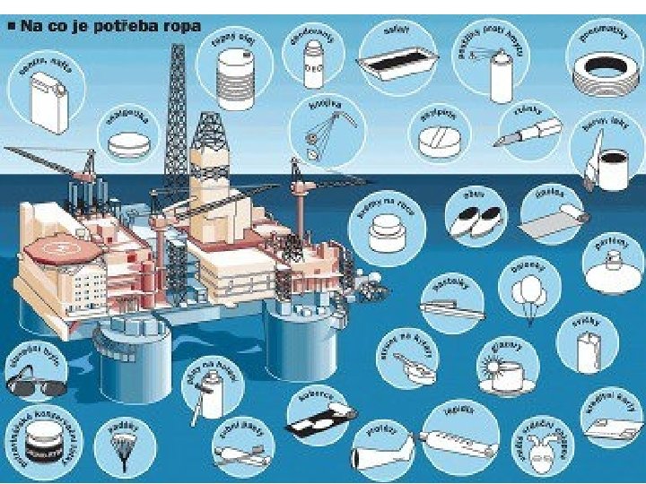 Zpracování a výrobky • • Vytěžená ropa se nejdříve zbavuje hrubých příměsí (písku) a vody. Potom se zpracovává metodou frakční destilace, která probíhá v průmyslových destilačních kolonách (rafinériích). Během frakční destilace se na základě rozdílné teploty varu oddělují v destilační koloně směsi uhlovodíků s blízkou teplotou varu - frakce. Frakční destilací ropy se získávají: plynné produkty - používají se jako chem. suroviny a paliva, např. směs propan-butan benzin - je použitelný jako palivo do zážehových motorů, tak jako rozpouštědlo barev a laků petrolej - je palivem do proudových a tryskových letadel. Je rozpouštědlem, vyrábí se z něj benzin a další látky, používá se také ještě ke svícení plynový olej - je ve směsi s petrolejem surovinou zvaná nafta, která se používá pro Dieselovy motory (v traktorech a automobilech), uplatní se i jako topná nafta v průmyslu a v domácnostech mazut - používá se k topení, např. v teplárnách a na lodích, nebo se dále destiluje asfalt - je izolačním materiálem a materiálem k úpravě vozovek těžké oleje, mazadla, syntetický kaučuk, dehet, umělá vlákna, kosmetické výrobky, barviva, výbušniny, umělá hnojiva atd.