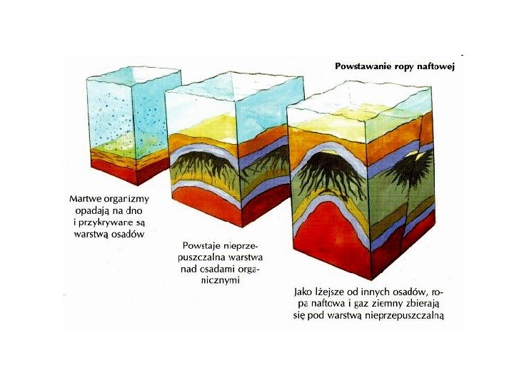 Powstawanie ropy naftowej (2) • Teoria organiczna: • Teoria ta została stworzona m. in. przez: B. Radziszewskiego, K. Englera, H. Höfera, J. E. Hackforda, D. White'a w myśl których ropa naftowa powstała przez przeobrażenie szczątków roślinnych i zwierzęcych nagromadzonych wraz z drobnymi okruchami mineralnymi w osadach morskich; czynnikami powodującymi przejście substancji organicznych w bituminy są prawdopodobnie: środowisko redukujące, odpowiednia temperatura i ciśnienie, działalność bakterii, oddziaływanie pierwiastków promieniotwórczych i innych.