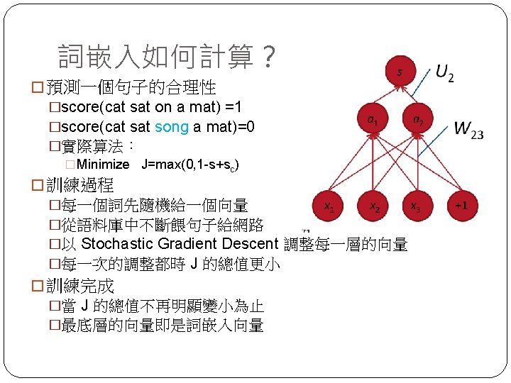 詞嵌入的計算方法 �Collobert& Bengio, 2011 �訓練時間 49 天 �Mikolov, 2013, Word 2 vec �訓練時間 1~2 天