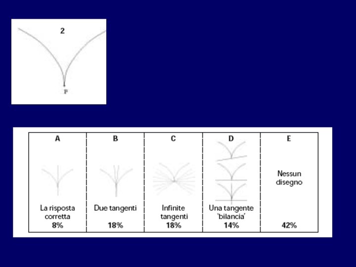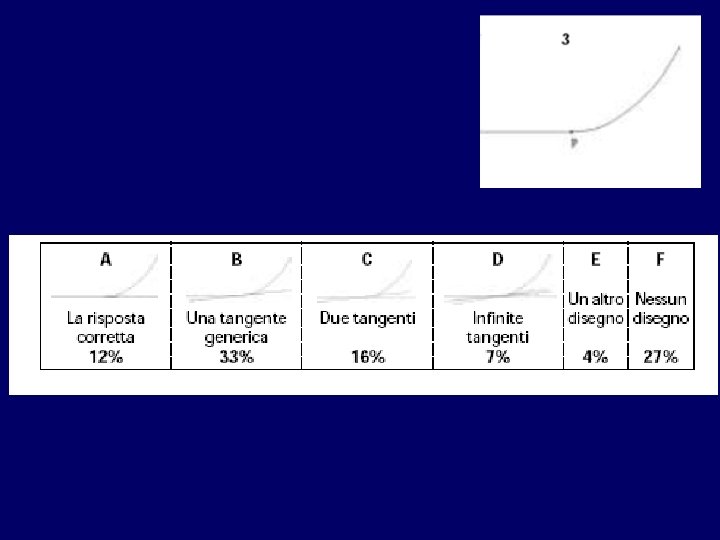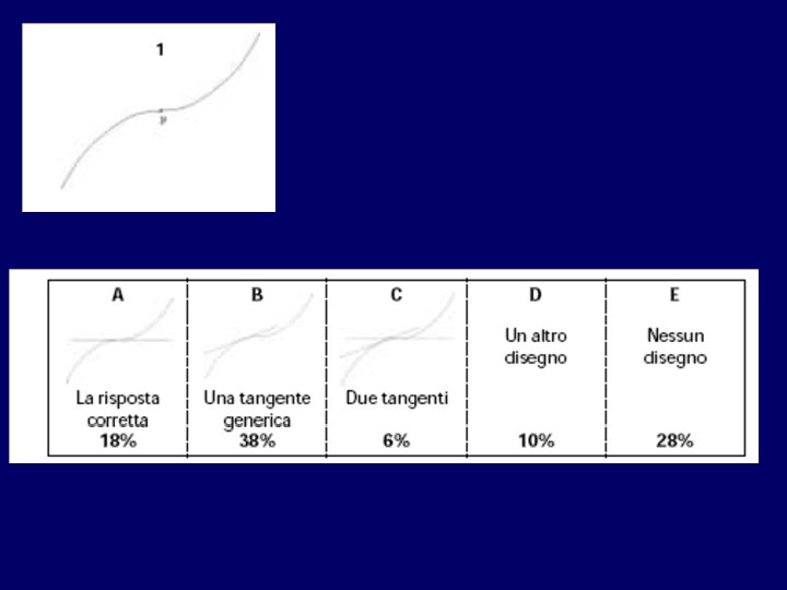 • Quando gli studenti seguono un corso di analisi ricevono in genere una definizione formale di tangente in un punto al grafico di una funzione derivabile come retta passante per quel punto con pendenza uguale alla derivata della funzione nel punto. • Nonostante questo, il loro modello di tangente, costruito attraverso esperienze che hanno coinvolto figure come le precedenti, può contenere elementi ‘parassiti’: ad esempio il vincolo che una tangente può incontrare una curva in un punto solo e non può attraversare la curva in quel punto. • Questo modello (o per usare le parole di Vinner: concept image) è confermato dalle risposte date alle seguenti domande da 278 studenti che seguivano un corso di analisi al primo anno di università: