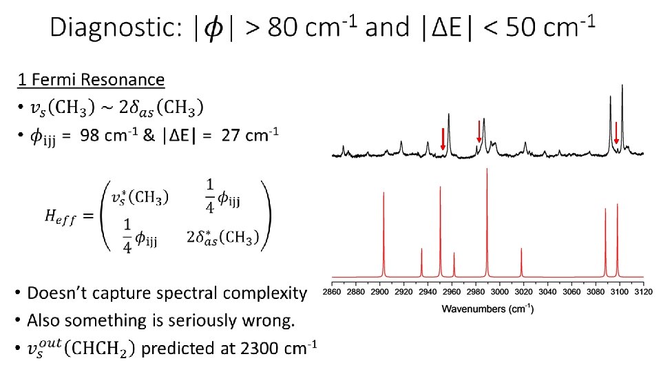 Anharmonic Theory: VPT 2+K • Defined method of correcting VPT 2 for resonances • VPT 2+K simulations can successfully model CH stretching spectra • Procedure: • • Identify strong (i. e. resonant) interactions Treat weak interactions with VPT 2. Build an effective Hamiltonian matrix of strongly-interacting states. Diagonalize to obtain anharmonic transitions & mixing • Include Darling-Dennison couplings to go even further beyond VPT 2. • See reference for implementation details, equations, etc. • Question: How do we decide which interactions are weak/strong? Rosnik, A. M. ; Polik, W. F. Mol. Phys. 2014, 112, 261.