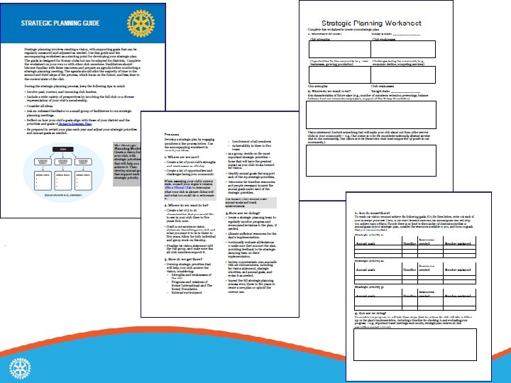 Introduction Strategic planning involves creating a vision, with supporting goals that can be regularly measured and adjusted as needed. Use this guide and the accompanying worksheet as a starting point for developing your strategic plan. The guide is designed for Rotary clubs but can be adapted for districts. Complete the worksheet on your own or with other club members. Facilitators should become familiar with these resources and prepare an agenda before conducting a strategic planning meeting. The agenda should allot the majority of time to the second and third steps of the process, which focus on the future, and less time to the current state of the club.