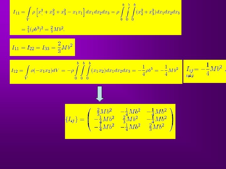Momente de inertie in raport cu axele de coordonate Tensor simetric Pentru distributii continue de masa EXEMPLE Determinati componentele Iij ale tensorului de inertie {Iij} pentru un cub de densitate uniforma, de latura b si masa M, avand unul din colturi plasat in origine b M