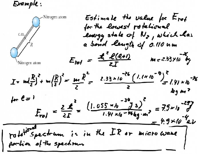 Rotational States Molecular spectroscopy: • We can learn about molecules by studying how molecules absorb, emit, and scatter electromagnetic radiation. • From the equipartition theorem, the N 2 molecule may be thought of as two N atoms held together with a massless, rigid rod (rigid rotator model). • In a purely rotational system, the kinetic energy is expressed in terms of the angular momentum L and rotational inertia I.