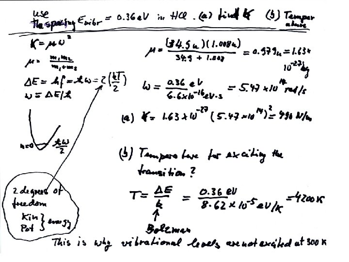 Vibrational States There is the possibility that a vibrational energy mode will be excited. • No thermal excitation of this mode in a diatomic gas at ordinary temperature. • It is possible to stimulate vibrations in molecules using electromagnetic radiation. Assume that the two atoms are point masses connected by a massless spring with simple harmonic motion: