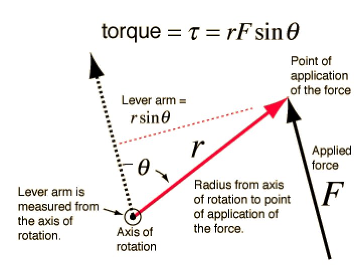 Torque • The ability of a force to rotate an object around that axis is measured by a quantity known as torque. • Torque is dependent on three things – Force – Lever arm – The angle between the two