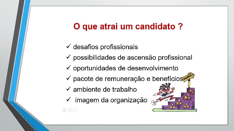 Recrutar melhor. . . • Recrutar melhor significa: contratar o melhor candidato para a sua vaga. Isto é, com o perfil mais adequado para aquela função ou com maior probabilidade de performar na empresa. • O recrutamento é a porta de entrada das pessoas nas empresas, e ter este processo bem desenvolvido está diretamente ligado ao sucesso da organização.