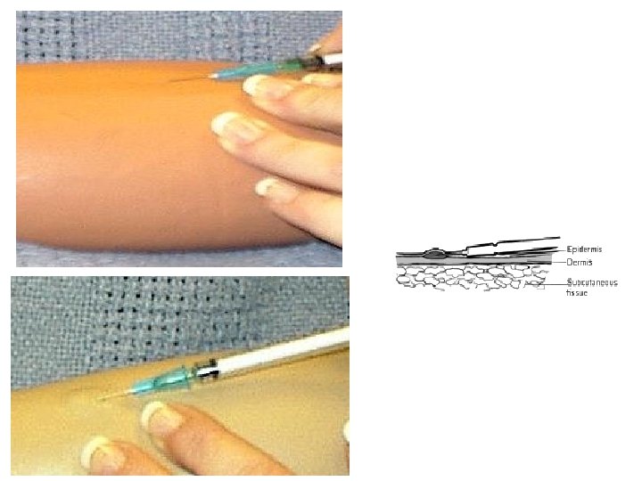 5. Hold the needle at a 15 degree angle to the skin with the bevel facing up. 6. Insert the needle through the skin, just below the epidermis into the dermis. 7. Inject the fluid, making a bubble just below the skin 8. Remove the needle 9. Dispose of used syringe and needle in a Sharps container