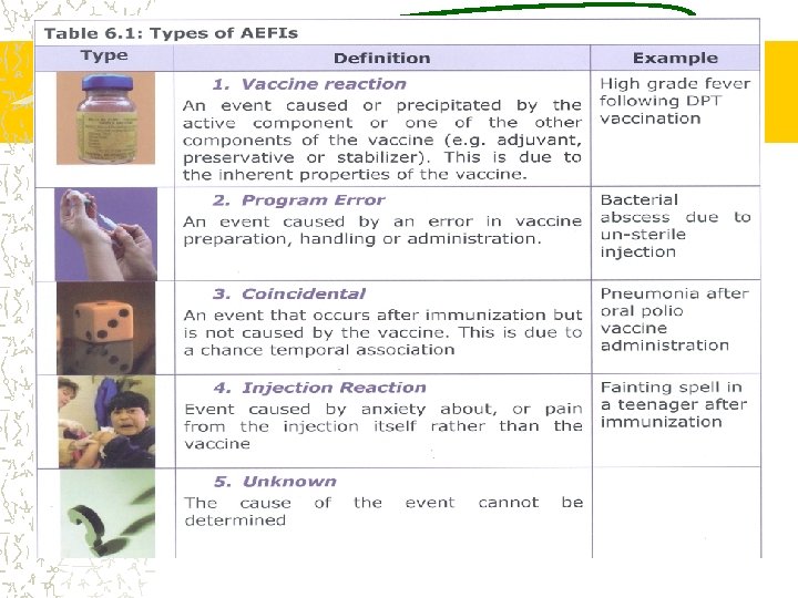 AEFI---- Rare, more severe reactions Include : § seizures, thrombocytopenia, § hypotonic-hypo responsive episodes, § persistent inconsolable screaming In most cases they are self-limiting and lead to no long-term problems Anaphylaxis, while potentially fatal, is