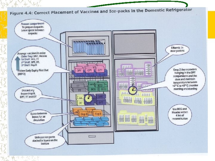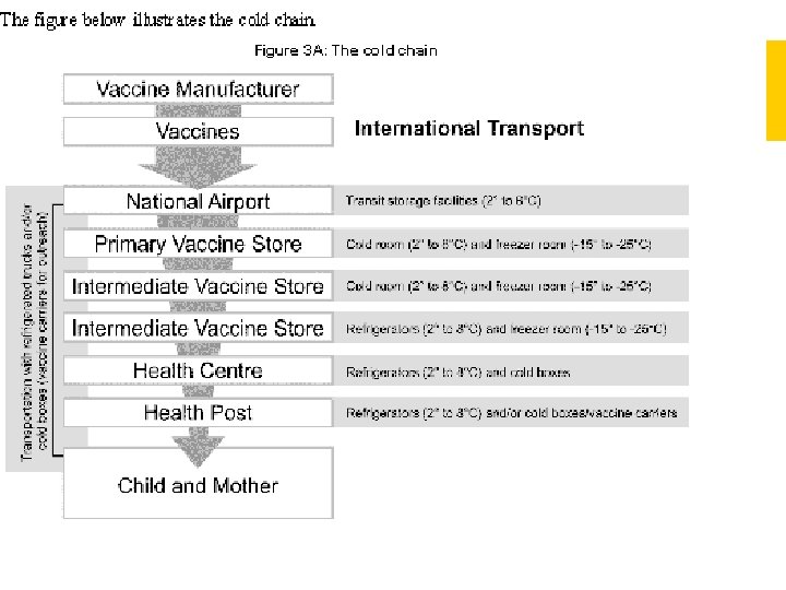 COLD CHAIN Cold Chain is a system of transporting and storing vaccines at recommended temperature from the point of manufacture to the point of use