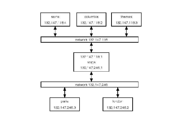 • Direct versus indirect routing • There are two types of routing: • direct When a machine can send an IP packet to another machine without going through a third machine, the route the packet will travel is said to be a ``direct route'' and the selection of that route is called ``direct routing''. In ``Example internetwork'', the machine columbia can trace a direct route to any of the machines on the 10. 0. 118 network (that is, seine, thames, and volga). The machine columbia cannot reach london or paris directly. • indirect When a machine wishing to send an IP packet to a second machine must send that packet through a third machine, the route the packet will travel is said to be an ``indirect route'' and the selection of the intermediary machine is called ``indirect routing''. The intermediary machine, a router, has connections to more than one network and is said to provide a gateway between the networks. Therefore, a router may also be called a ``network gateway''. In ``Example internetwork'', the machine volga is a network gateway between the 10. 0. 118 network and the 10. 0. 246 network. If the machine seine needs to send an IP packet to paris, it must send the packet to volga, which forwards the packet to paris. Sometimes the source and destination hosts are more than one network away from each other.