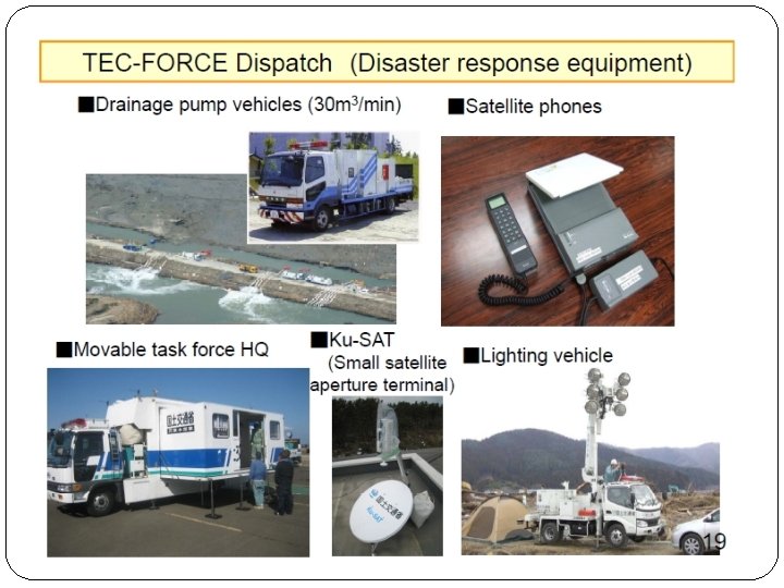 Immediate Response Collect damage information � Personnel in helicopters sent to Tohoku's four affected areas � Followed 1, 880 closed-circuit television cameras already installed throughout the region for monitoring highways and rivers