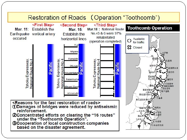 Response and Recovery 1. Temporary recovery work in the short term 2. Permanent restoration of roads to pre-disaster conditions in the longer term � Responsible agency: Tohoku Regional Bureau of the Ministry of Land, Infrastructure, Transport, and Tourism (MLIT)